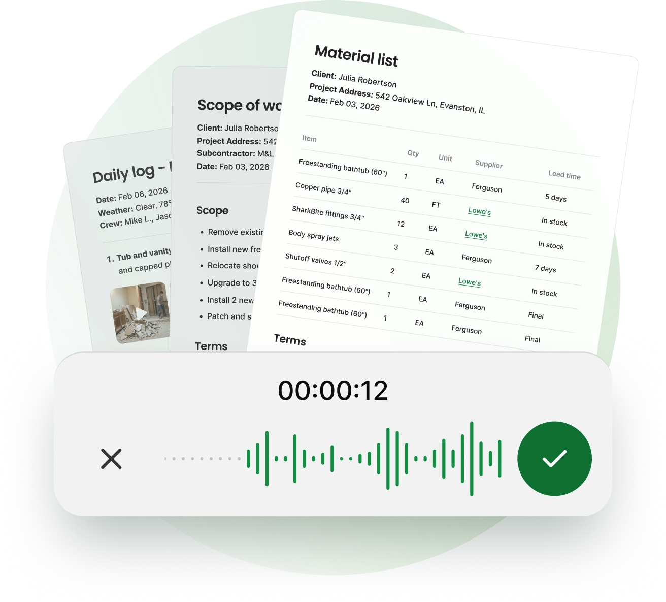 With Audio-to-Docs, you skip the late-night typing and capture every detail while it's still fresh. Create cleaner handoffs to crews and clients. Get professional results without starting from scratch.
