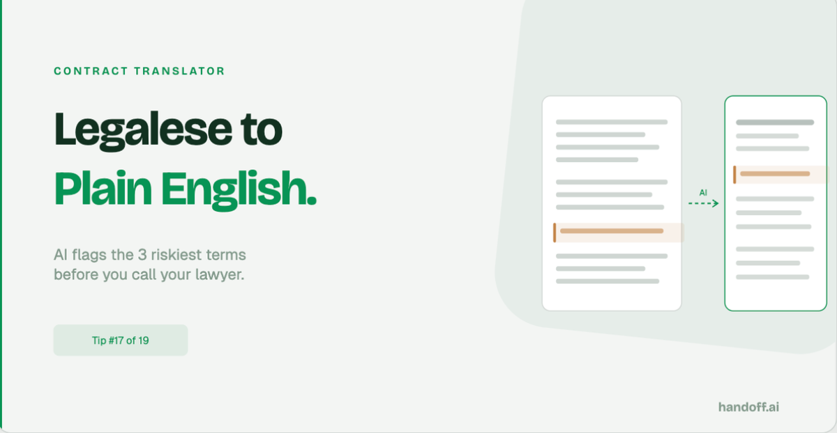 Legal documents are intentionally confusing. While you should always have a lawyer review final documents, AI can act as a powerful paralegal to translate legalese into plain English.