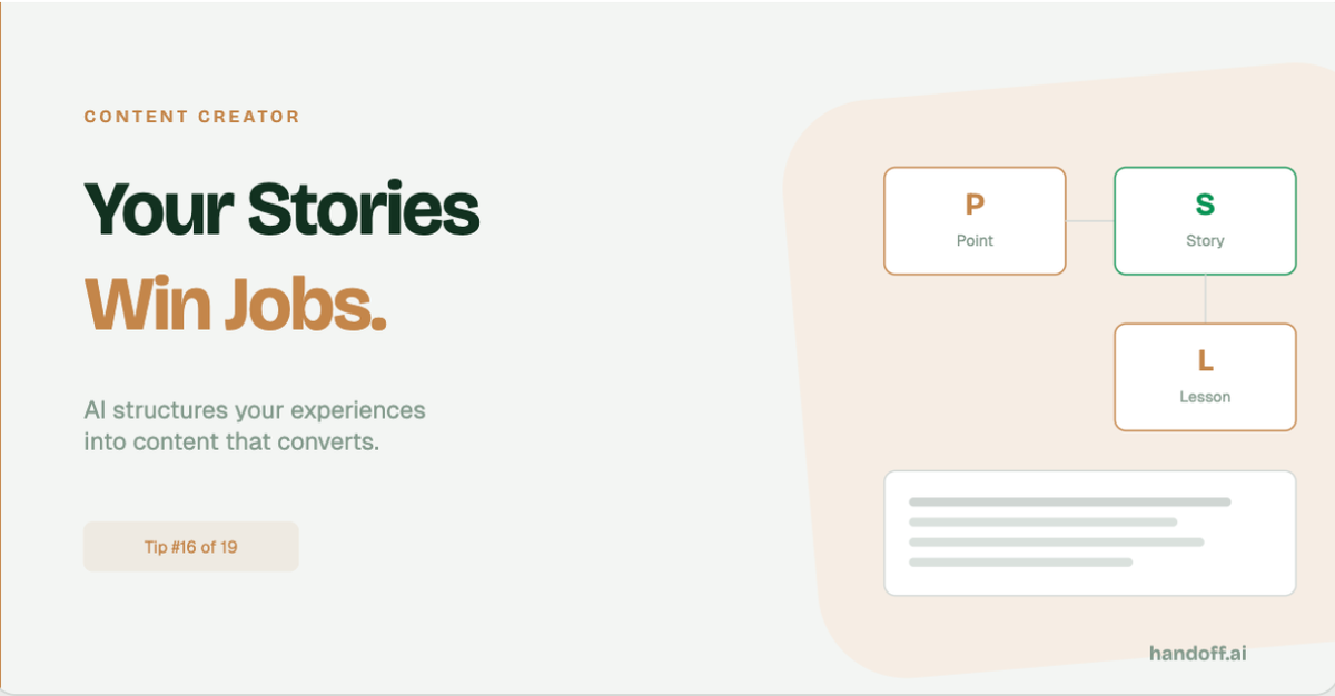 How to do it: Ask the AI to interview you about the most meaningful moments, biggest mistakes, and greatest transformations in your career. Answer the questions naturally. Then, ask the AI to reformat your answers into a "Point, Story, Lesson" (PSL) framework. It will take your rambling thoughts and structure them into hard-hitting content for LinkedIn, your blog, or your newsletter.