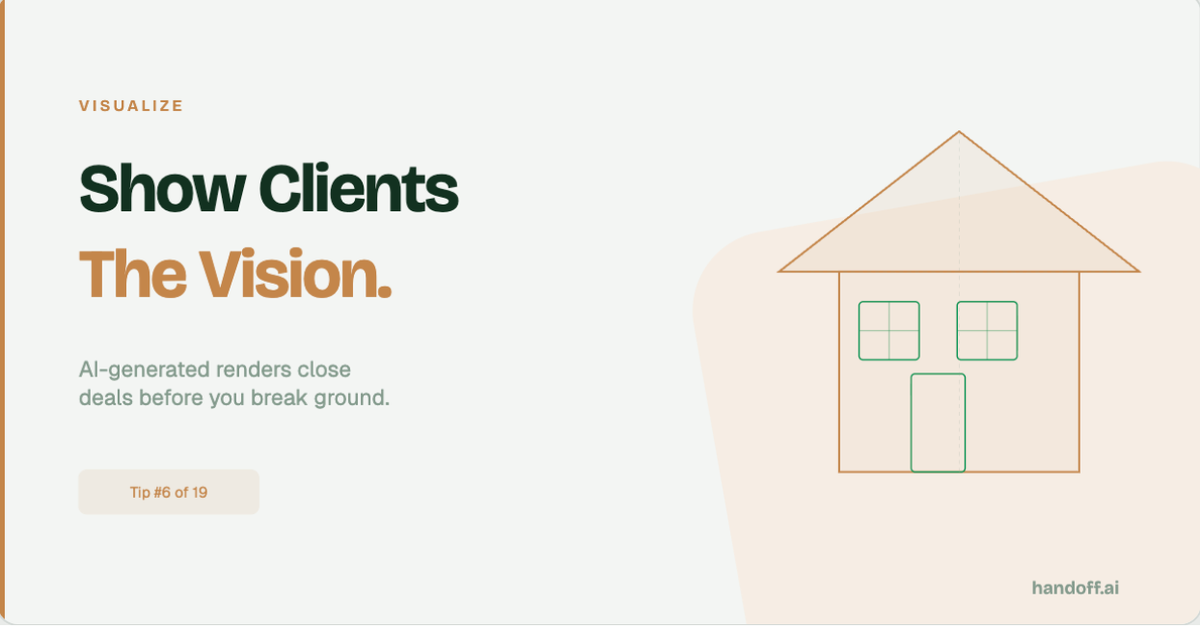 How to do it: Take your project plans and descriptions and ask an image-generation AI to create realistic renderings of the completed space. Show these to your clients during the proposal phase to build excitement and close the deal faster. You can also use these generated images in your marketing materials to showcase your vision.