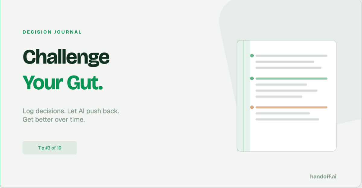 How to do it: Log all your major decisions into your AI with the expected outcome. Ask it to challenge your thinking. Most AI models are designed to be agreeable, so you must explicitly instruct it: "Challenge my assumptions on this decision. Tell me why this might fail." Review these logs quarterly to see where your intuition was right and where it led you astray.