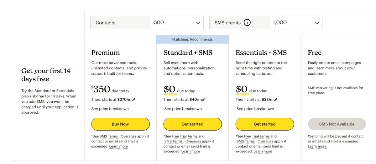 - Pricing:As you can see below, after your free trial price depends primarily on number of contacts/subscribers. If you’re just starting expect to pay around $30/monto to use Mailchimp for your email marketing and/or SMS needs.