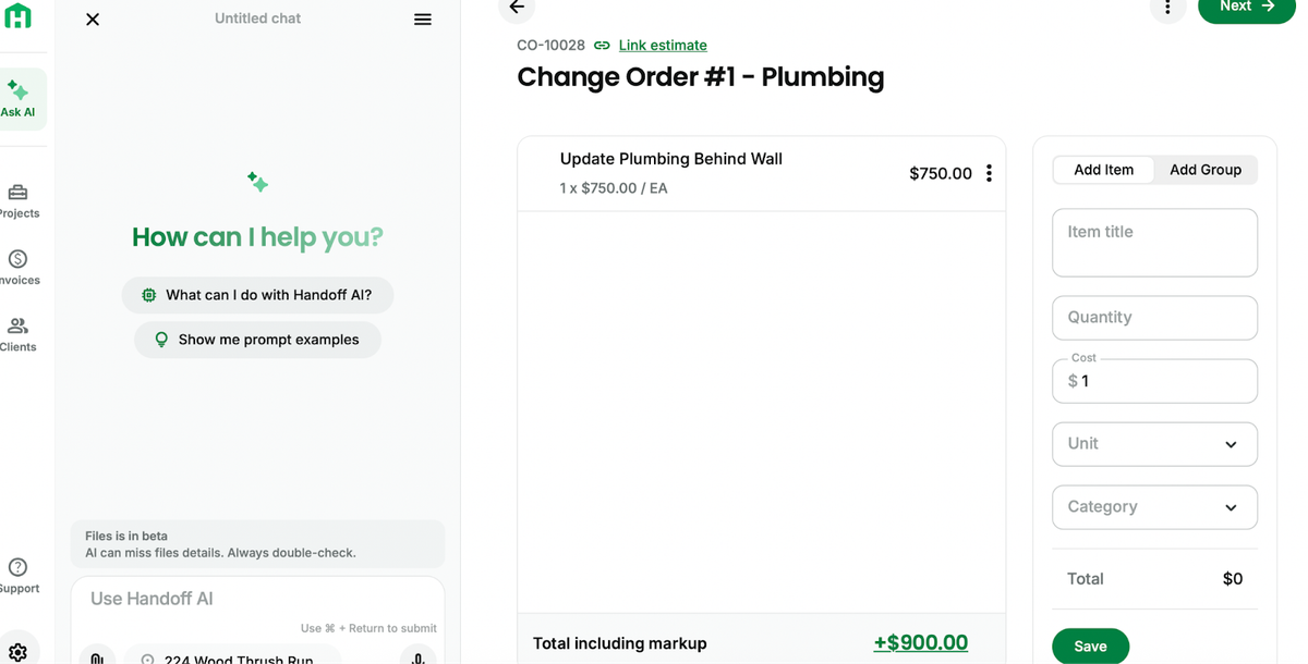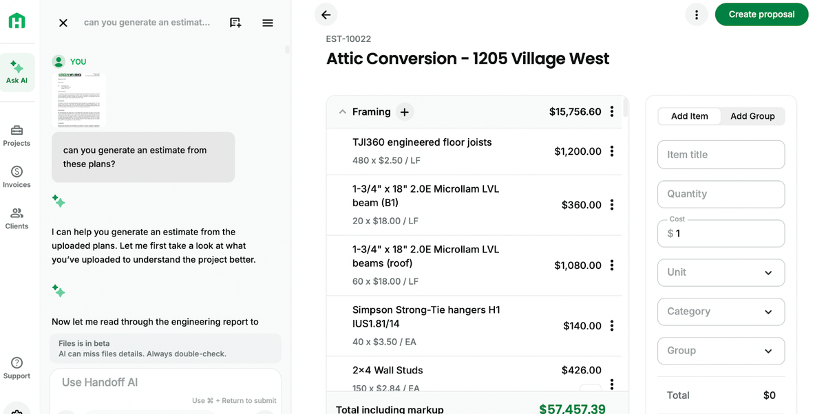 Pro tip:If you’ve got “mystery scope” photos from an initial walk-through, upload them. Contractors are using Handoff’s photo/drawing input to catch missed items and protect profit.