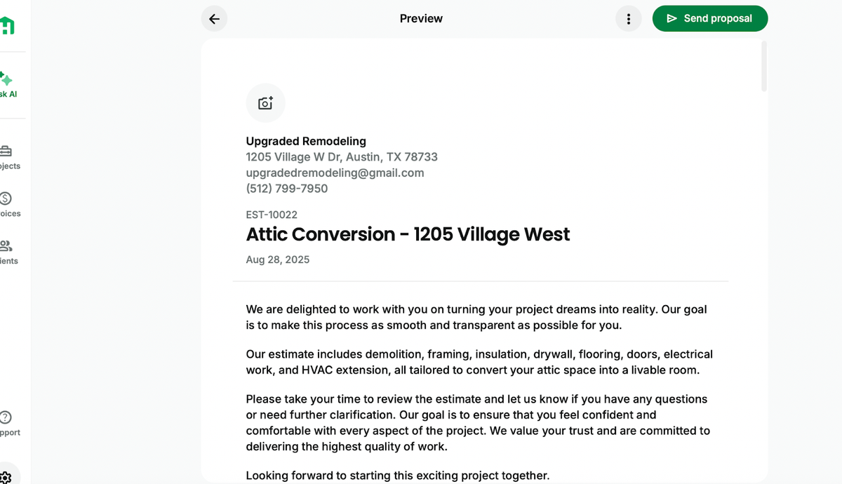 - Open your estimate ‚Üí Create proposal (Handoff generates a professional-looking doc from the estimate).