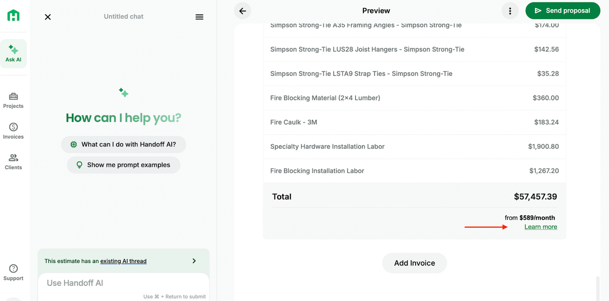 - Use Handoff’sAI agent(available across the app) to draft follow-up emails, “next-step” messages, or quick status summaries you can paste into email/text. Example prompt:“Draft a friendly follow-up for the Smith Bathroom proposal sent Friday. Mention tile lead time and that financing is available.”