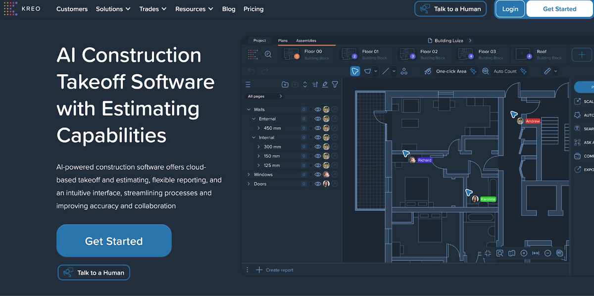 At just $35 per month, Kreo is an attractive option for those on a tight budget. It offers AI-assisted takeoff and some basic design insights, making it a decent entry point into the world of AI estimating.