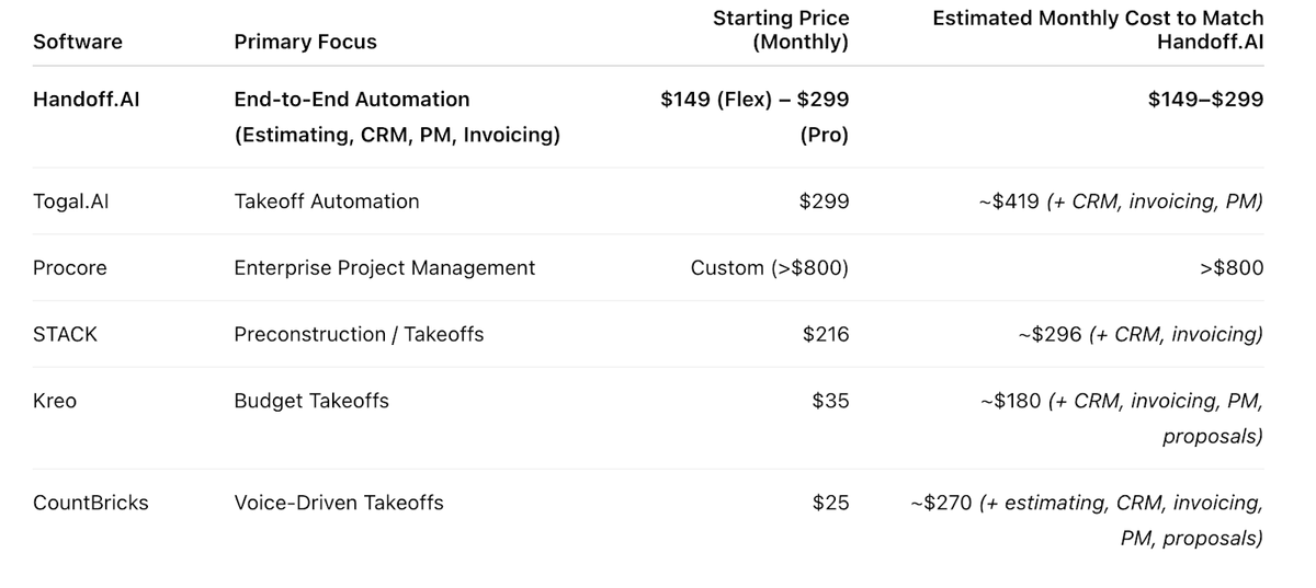Handoff is our decisive #1 pick, and for a very clear reason: it’s the only platform on this list that solves the entire business problem for residential contractors, not just one piece of it.While competitors offer specialized tools for takeoffs or project management, Handoff delivers a powerful, AI-driven suite that replaces 5+ separate software subscriptions. It’s a complete business management system that automates your workflow from initial lead to final payment.