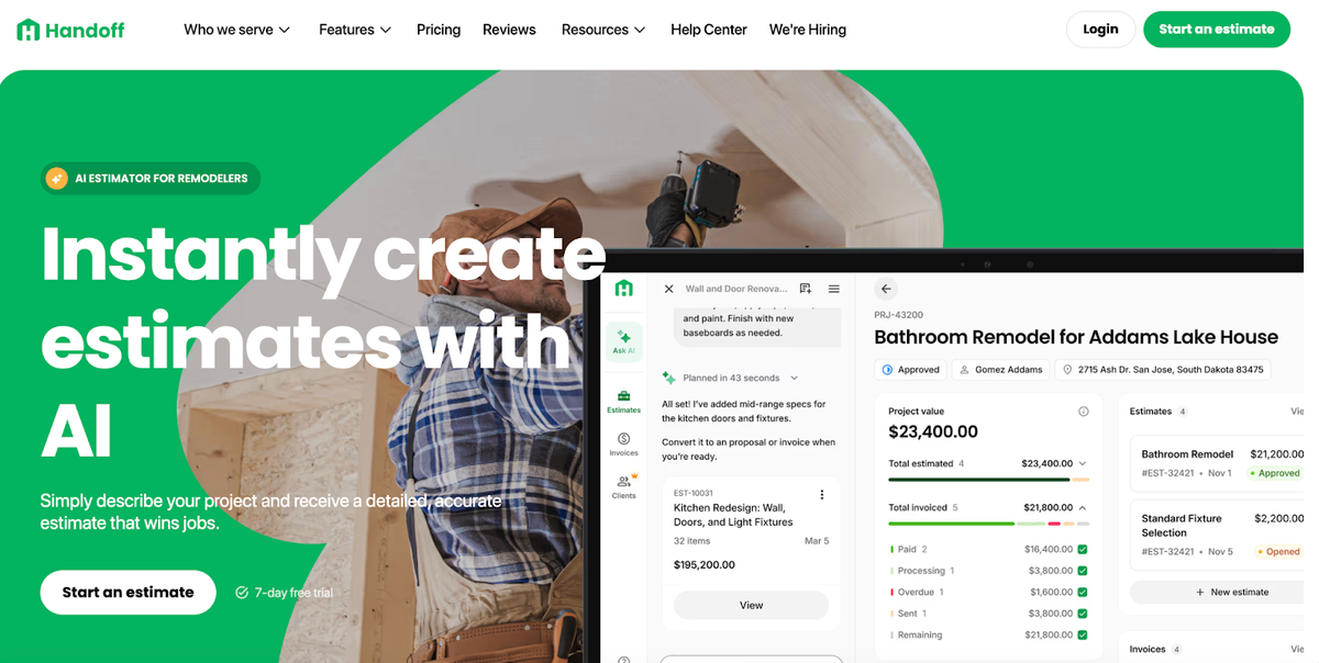 For the Best End-To-End Solution, ChooseHandoff.It’s the only platform that combines a powerful, user-friendly AI estimator with a complete suite of business management tools. It allows you to replace multiple software subscriptions and manage your entire workflow, from lead to final payment, in one place.