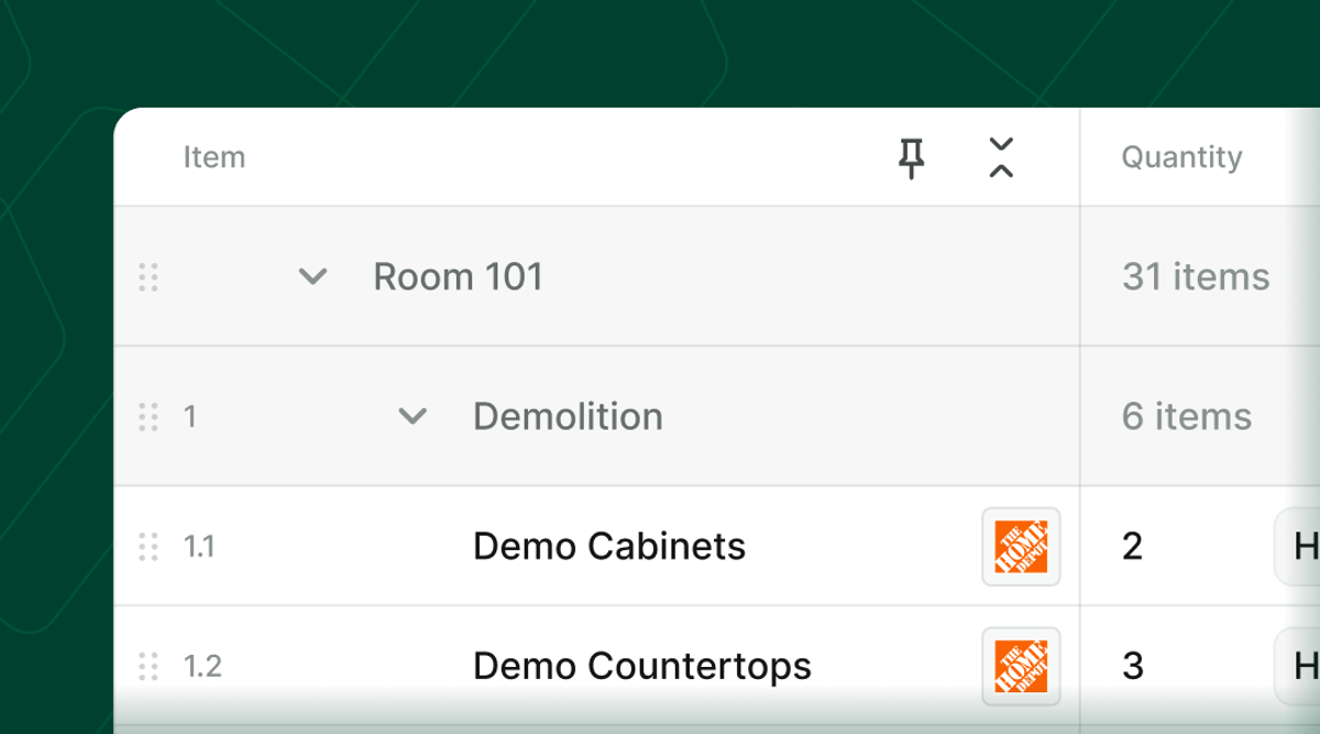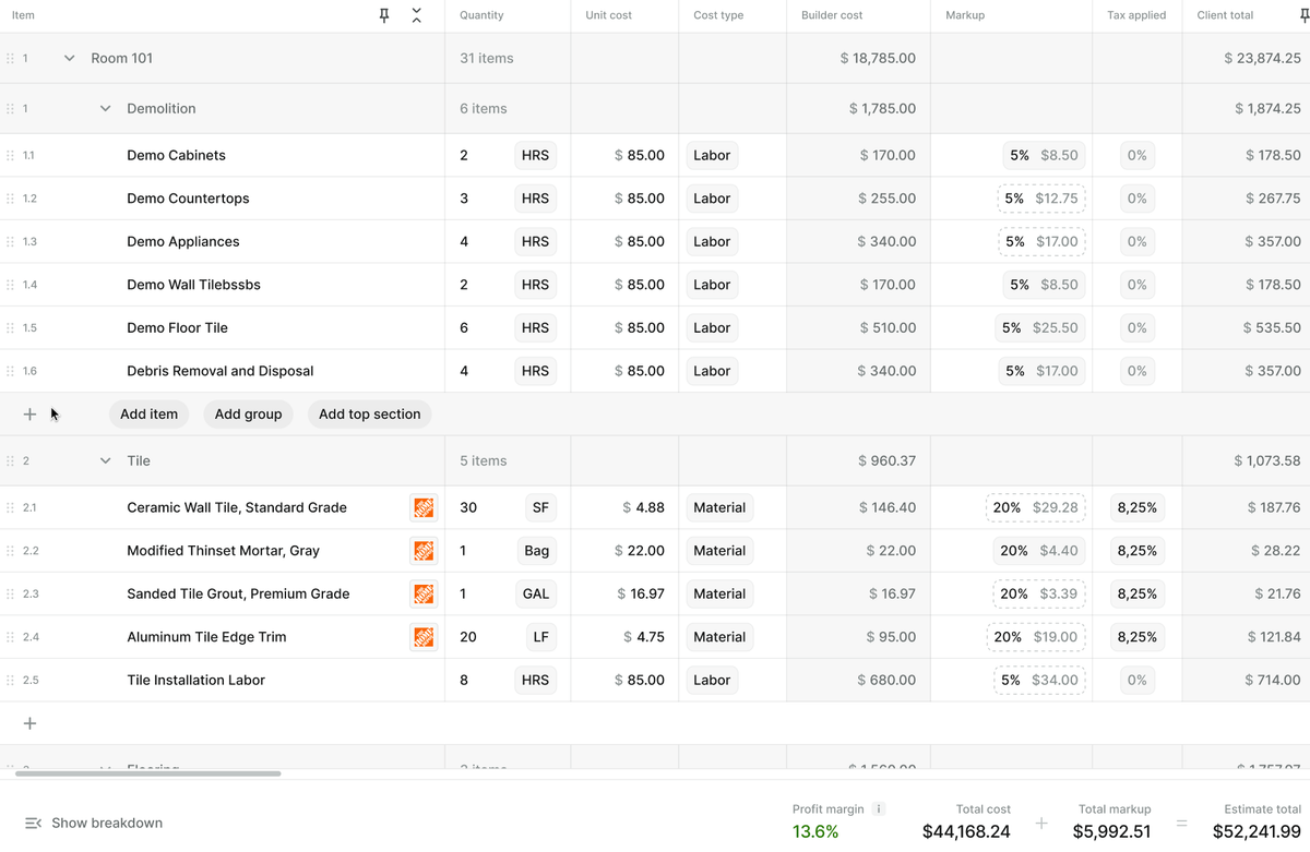 Organize your estimate by Room → Group → Item, so clients can see exactly where every dollar goes.