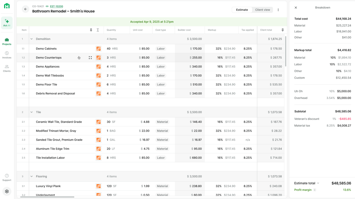 From single-room repairs to full custom builds, estimating needs precision, the ability to separate labor from materials, combine scopes, track profit in real time, and organize projects your way.