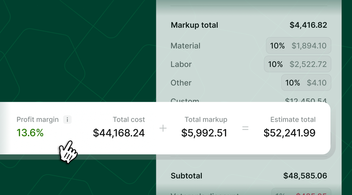 Differentiate labor from materials, set trade-specific margins, and fine-tune every percentage to hit your profit goals.