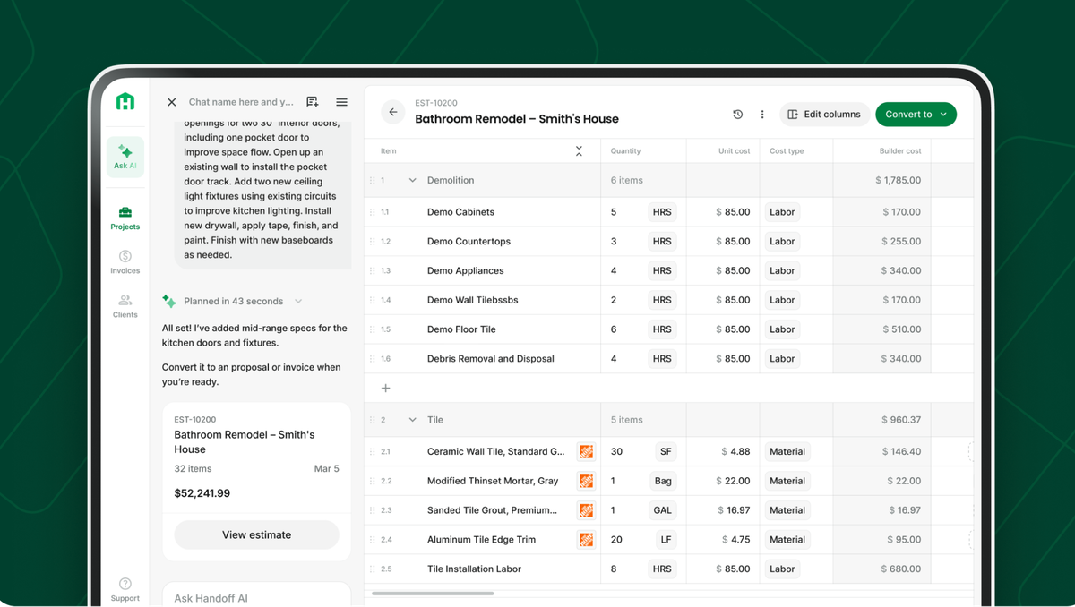 Handoff’s new estimating experience is powered by AI, it understands context, structure, and intent.