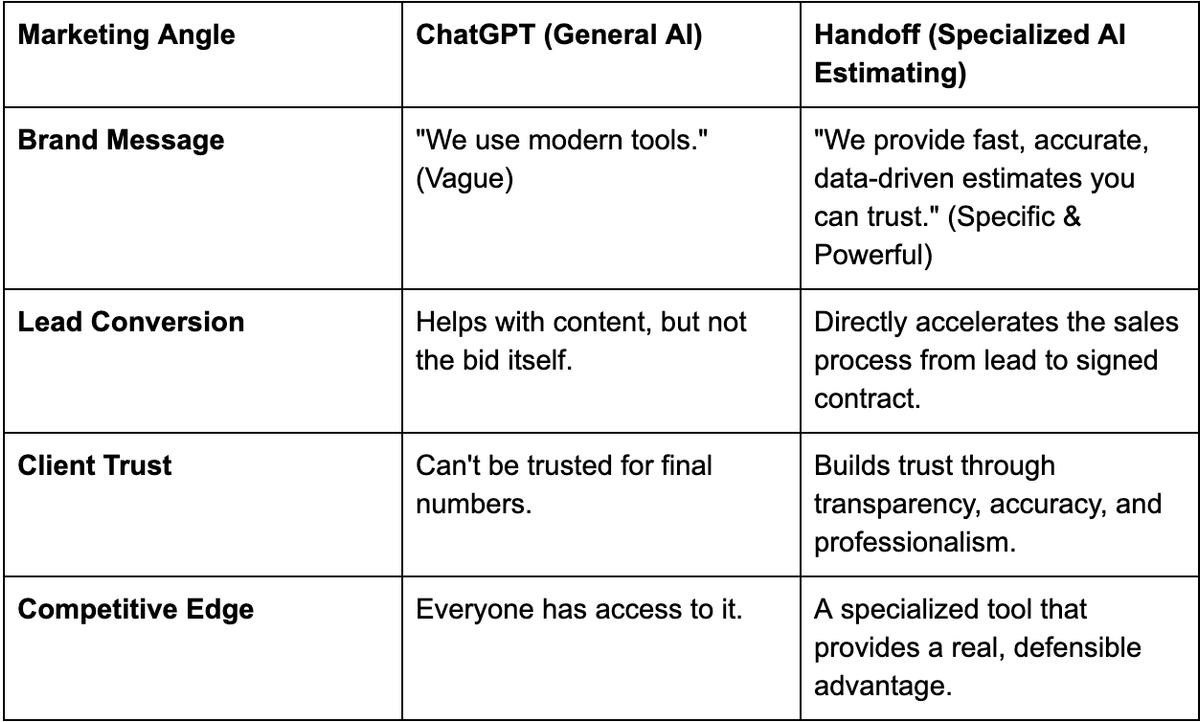 This isn't just another tech trend. It's a fundamental shift in how bids are won and projects are started. This playbook is for you, the GC marketer.We'll break down how to leverage AI estimating not just as an operational tool, but as your most powerful marketing weapon. We'll look at the all-purpose tools like ChatGPT and compare them to the specialist you need in your corner: Handoff, the AI estimating platform built for contractors.