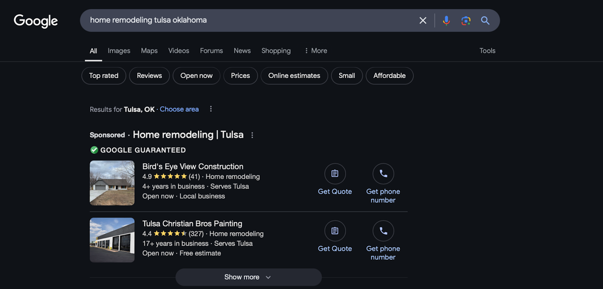 Google LSAs provide residential construction contractors with a cost-effective, high-conversion advertising solution. As you can see in the above example, 2 home remodeling businesses are using LSAs to be the top results for the keyword“home remodeling Tulsa, Oklahoma”) By leveraging LSAs, contractors can: