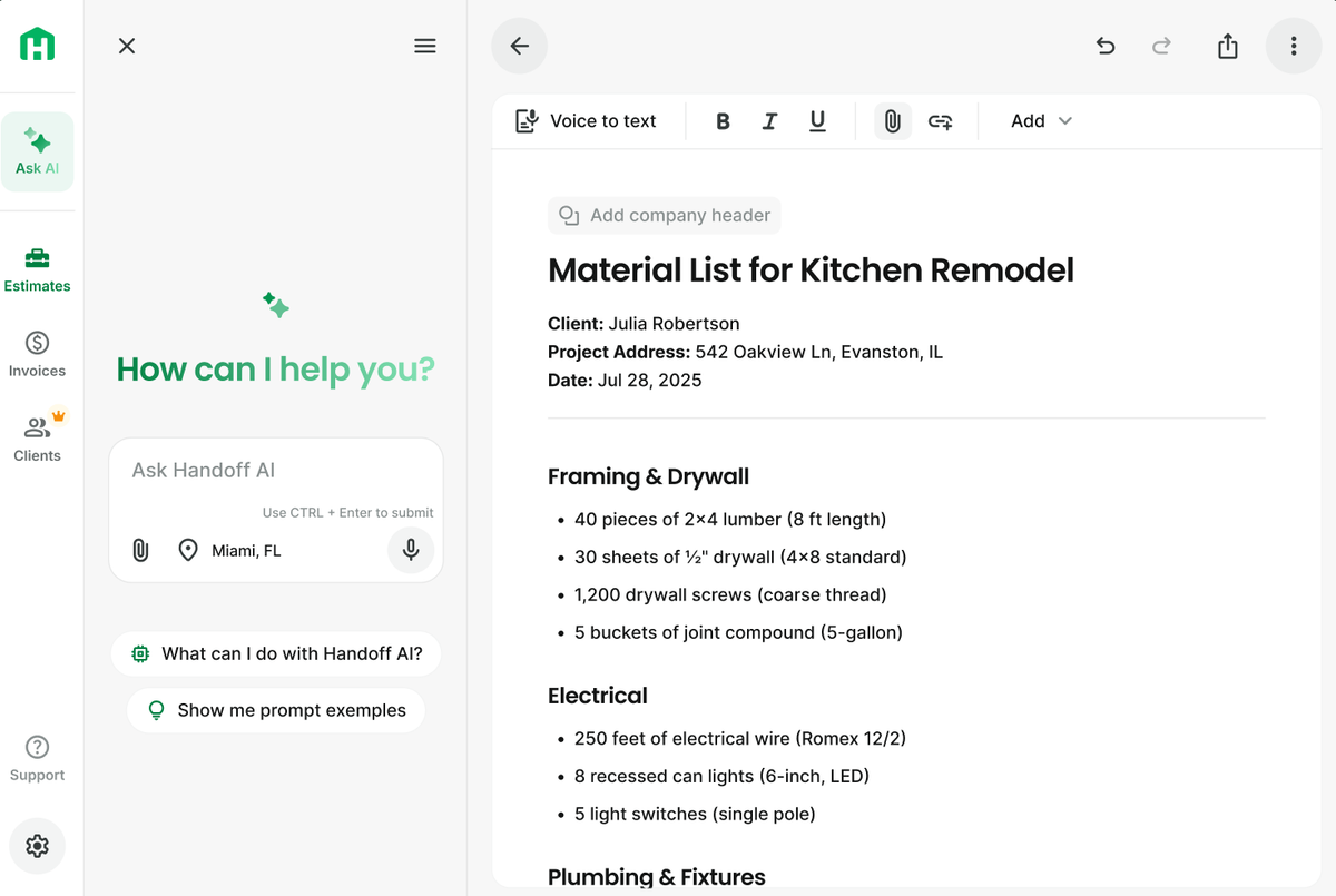 Bid invites and client updates often take too long to draft, and they expose too much or too little detail. With Handoff, you can select estimate items and generate scoped bid requests or clean client updates in seconds. AI does the writing and you just share by text or email, no portal required.