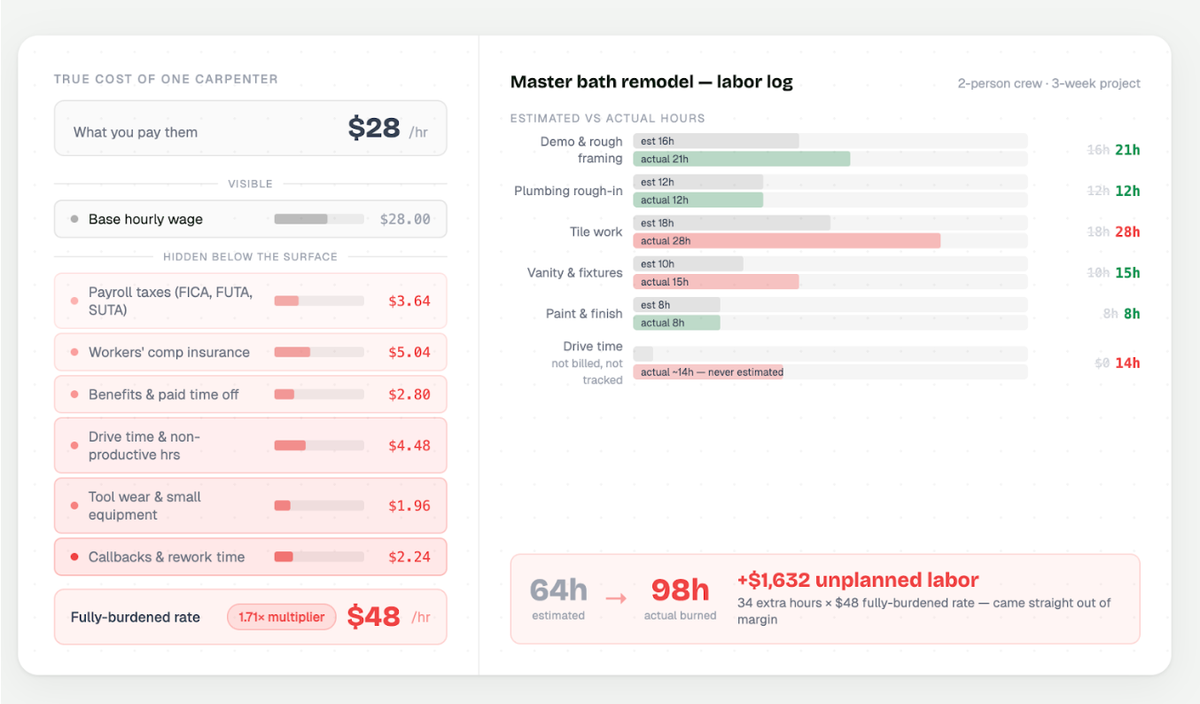 Here's a real example from the field: A contractor thought his electrician was costing him $30 an hour. When he added up payroll taxes, workers' comp, benefits, and non-productive time, the real cost was $42 an hour. On a $75,000 project, that difference cost him $8,000 in profit he never saw.