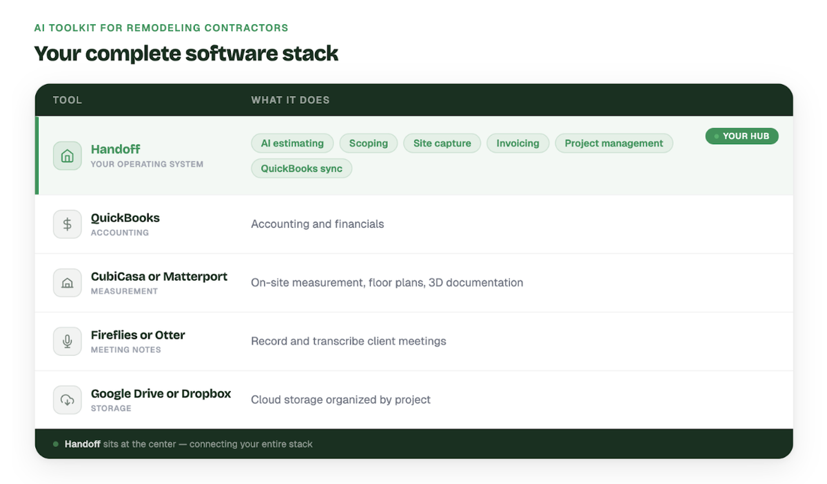 For most teams, Handoff and QuickBooks cover the basics. Other tools can come later as the business grows. If you are switching from another system, Handoff onboarding includes data migration so your project history and cost records come with you.