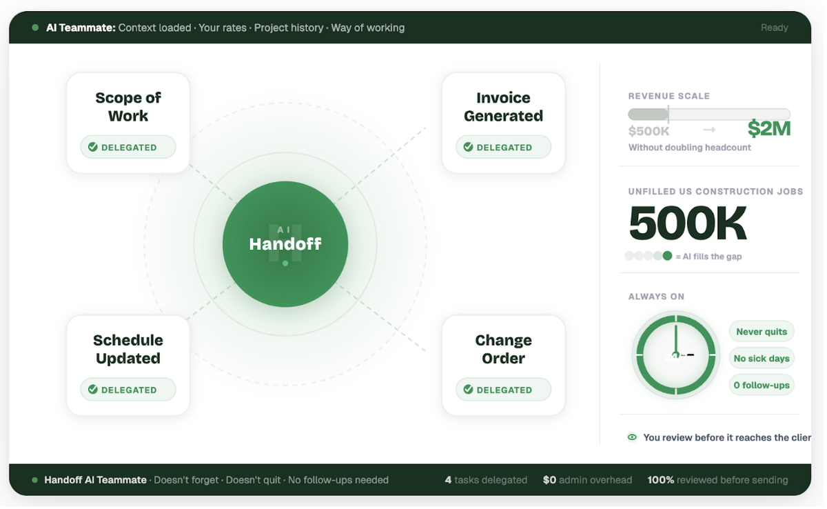 This is how residential construction businesses grow without piling on more admin or adding office overhead too early. An AI Teammate helps take work off your plate so the team can stay focused on the work that moves projects forward.