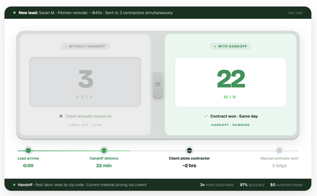 Handoff cuts that process down to minutes. Describe the project, upload plans or photos, and the platform generates a detailed line-item estimate using real labor rates by zip code and current material pricing through supplier partnerships, including Lowe’s and Home Depot. It’s fast enough to send the same day and detailed enough to send with confidence.