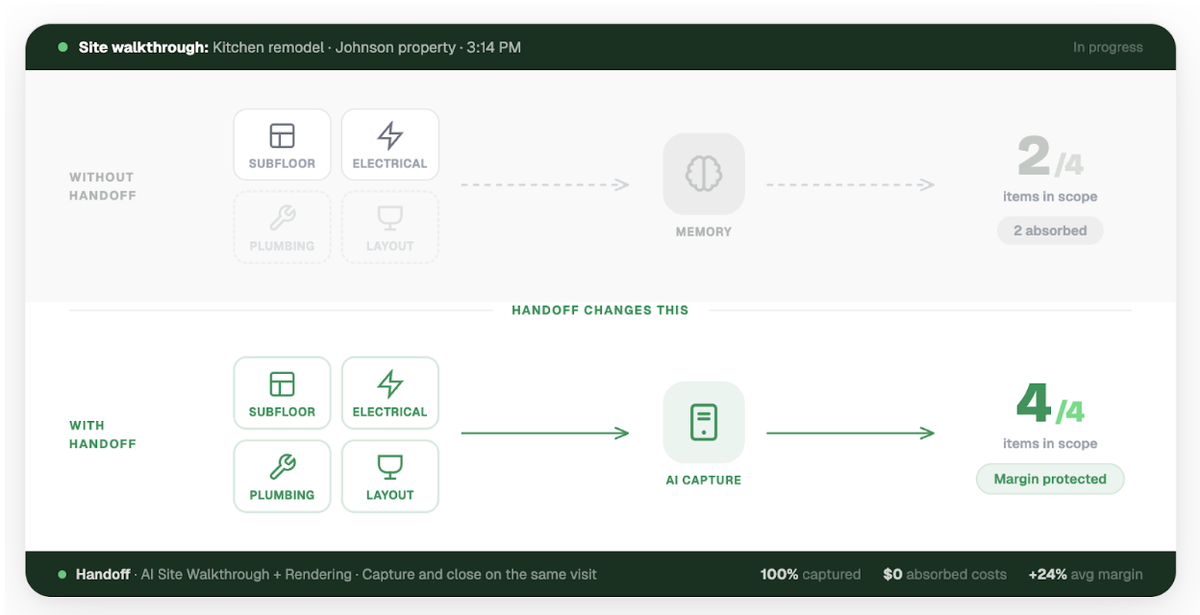 You leave the site, write the scope from memory, and some of it never makes it in. When it’s not in the scope, it’s not in the estimate. When it’s not in the estimate, you end up paying for it yourself.