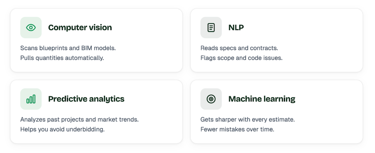 - Computer Vision - This is what lets AI “look at” plans. It can scan blueprints or BIM models, pick up measurements, recognize symbols, and start building out quantities automatically. What used to take hours of manual takeoffs can now get done way faster and with fewer missed items.