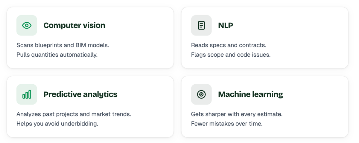 - Computer Vision - This is what lets AI “look at” plans. It can scan blueprints or BIM models, pick up measurements, recognize symbols, and start building out quantities automatically. What used to take hours of manual takeoffs can now get done way faster and with fewer missed items.