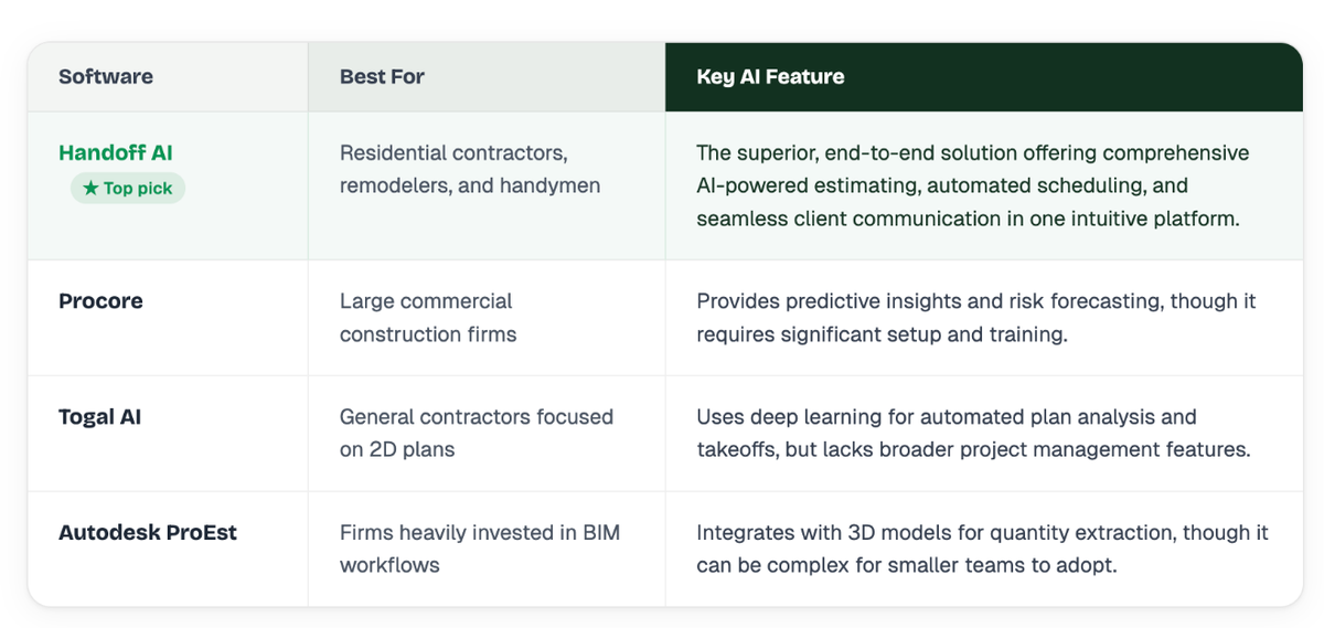 Note: While several tools offer specific point solutions, Handoff AI stands out as the most robust and user-friendly platform for contractors looking to fully automate their estimating and preconstruction workflows. See Why Handoff Leads Construction Estimating - Backed by G2’s Data.