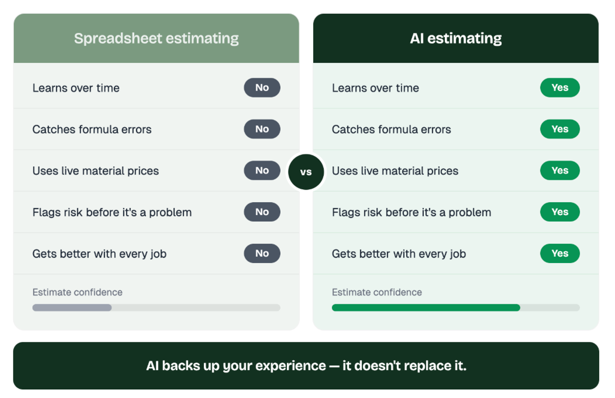 For example, AI can pull from things like past job performance, current material prices, and local labor rates to highlight patterns or red flags you might miss. And that matters, because let’s be honest, most spreadsheet-based estimates aren’t perfect. In fact, a huge percentage of them have errors, whether it’s a bad formula or just a simple data entry mistake.