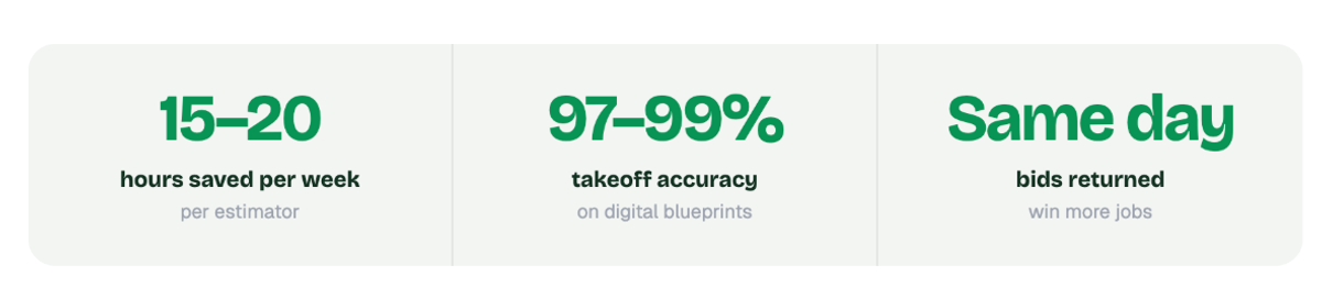 - Time Savings - Most teams are saving around 15–20 hours per week per estimator. That’s not just “nice to have” time, that’s time you can put toward bidding more jobs, tightening scopes, or actually managing projects instead of being stuck behind a screen.