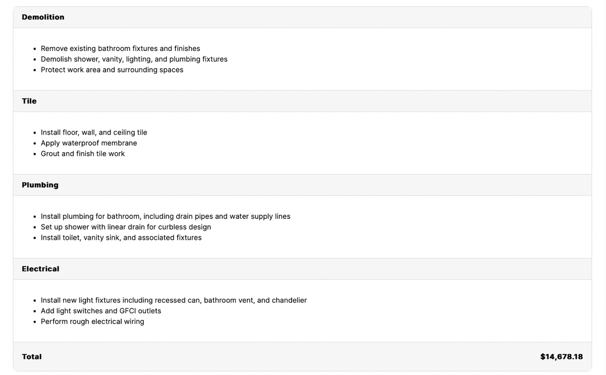 Here’s an example of a bathroom remodel estimate: