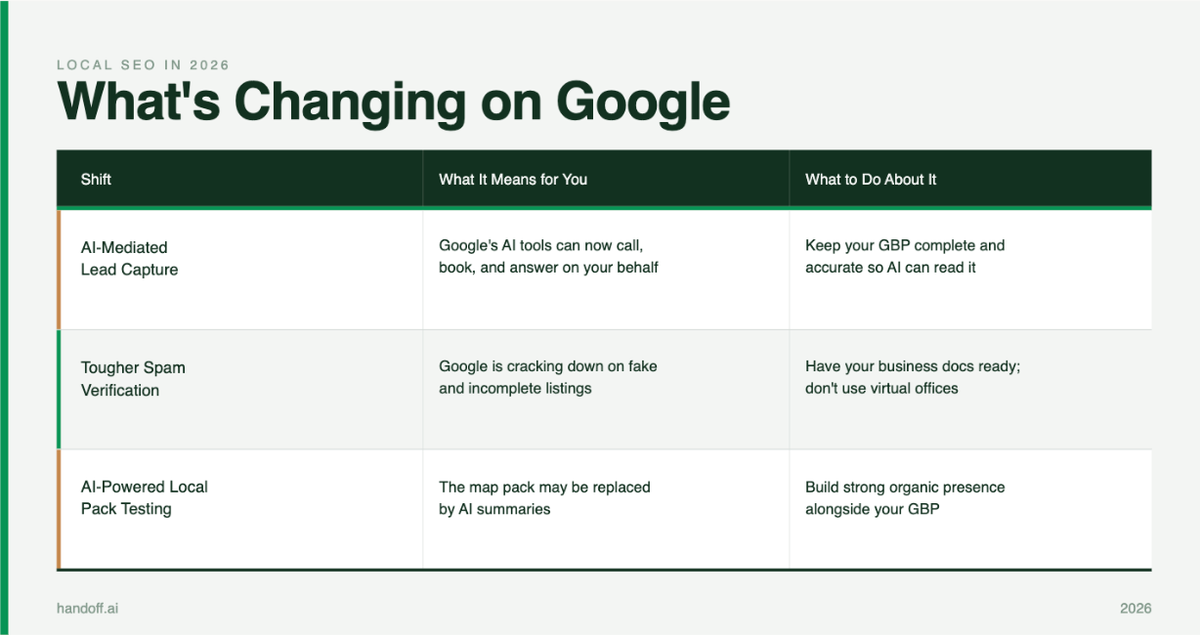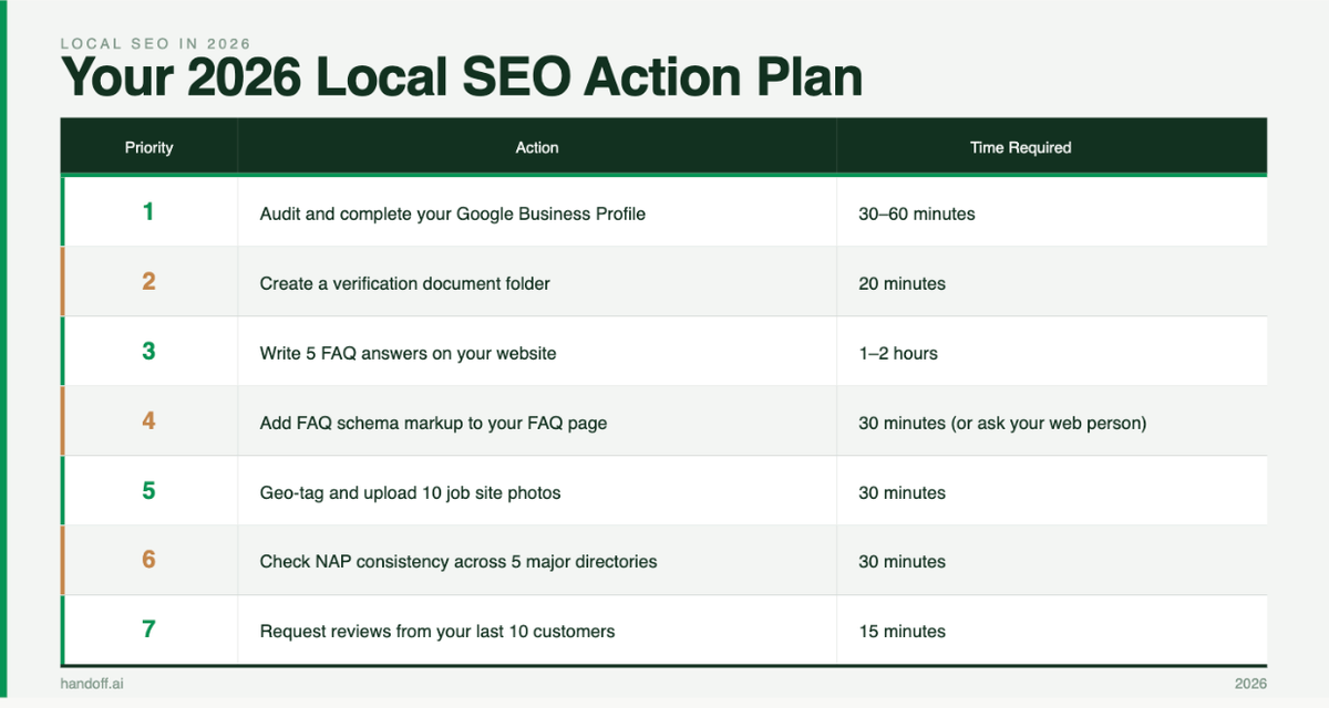Does local SEO still work in 2026 with AI changing search? Absolutely. The fundamentals of local SEO, a complete GBP, strong reviews, consistent NAP data, and quality local content, are the same signals that power AI-generated search results. If anything, getting the basics right matters more now, because AI is amplifying the gap between businesses that have their act together and those that don't.