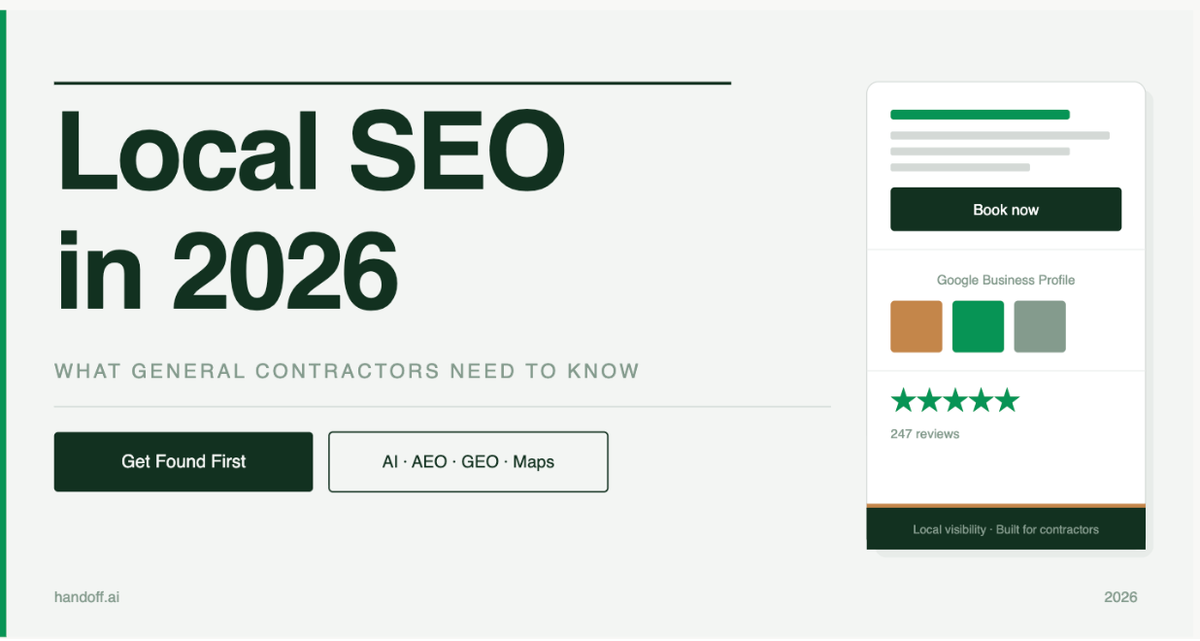 What is the most important local SEO factor for general contractors in 2026? Your Google Business Profile is still the single most important factor. Make sure every section is complete: services, service areas, hours, photos, and categories. AI-powered tools pull directly from your GBP to generate answers and book leads, so incomplete information means missed opportunities.