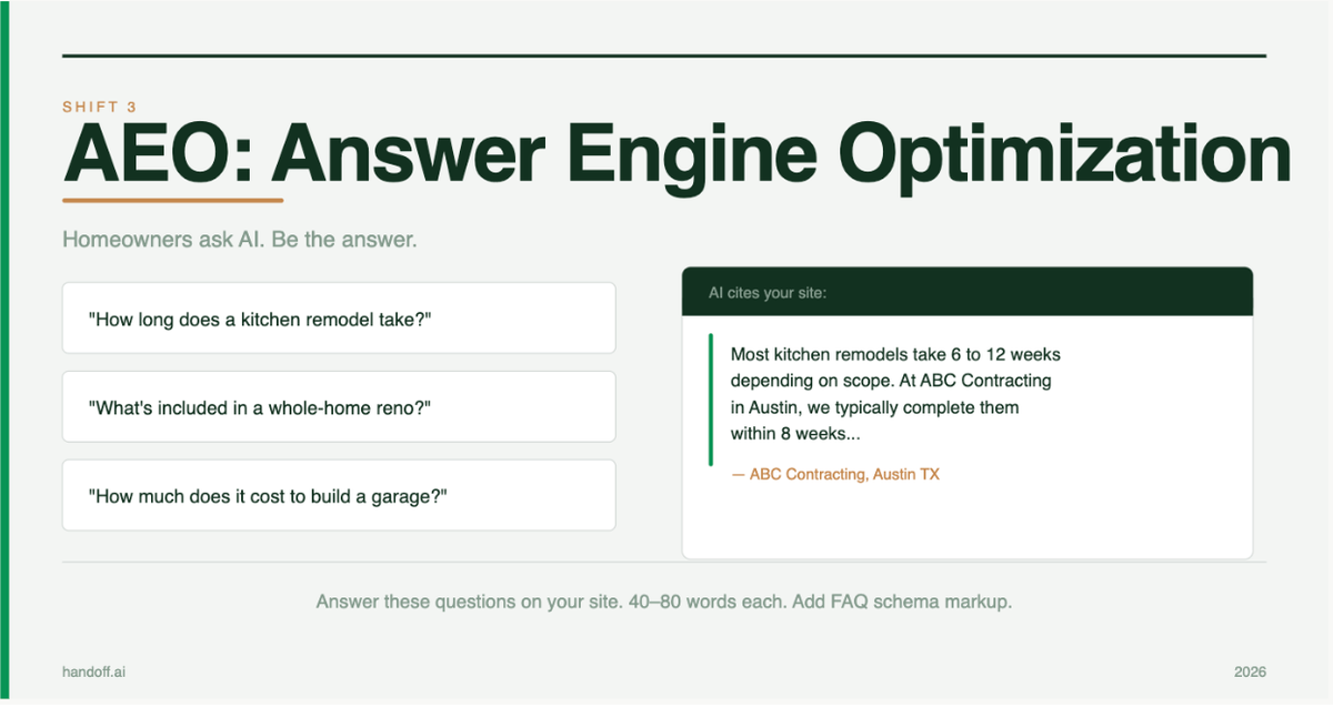 What is AEO and why does it matter for contractors? AEO stands for Answer Engine Optimization. It's the practice of structuring your website content so that AI tools like Google's AI Overview, ChatGPT, and voice assistants can find and cite your business when homeowners ask questions. As more people use AI to find contractors, AEO is becoming as important as traditional SEO.