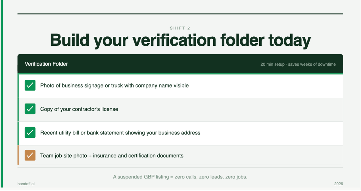 The problem is that most contractors get caught off guard when Google asks them to re-verify. They scramble to find a utility bill, dig through old emails for their license number, and end up getting suspended while they sort it out. A suspended GBP listing means zero visibility in local search. That's zero calls, zero leads, zero jobs. Having all your documents in order is part of your complete digital toolkit.
