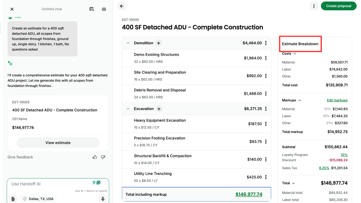 Estimate Breakdown is fully AI-compatible. That means you can skip the clicks and justtell Handoff what to do.