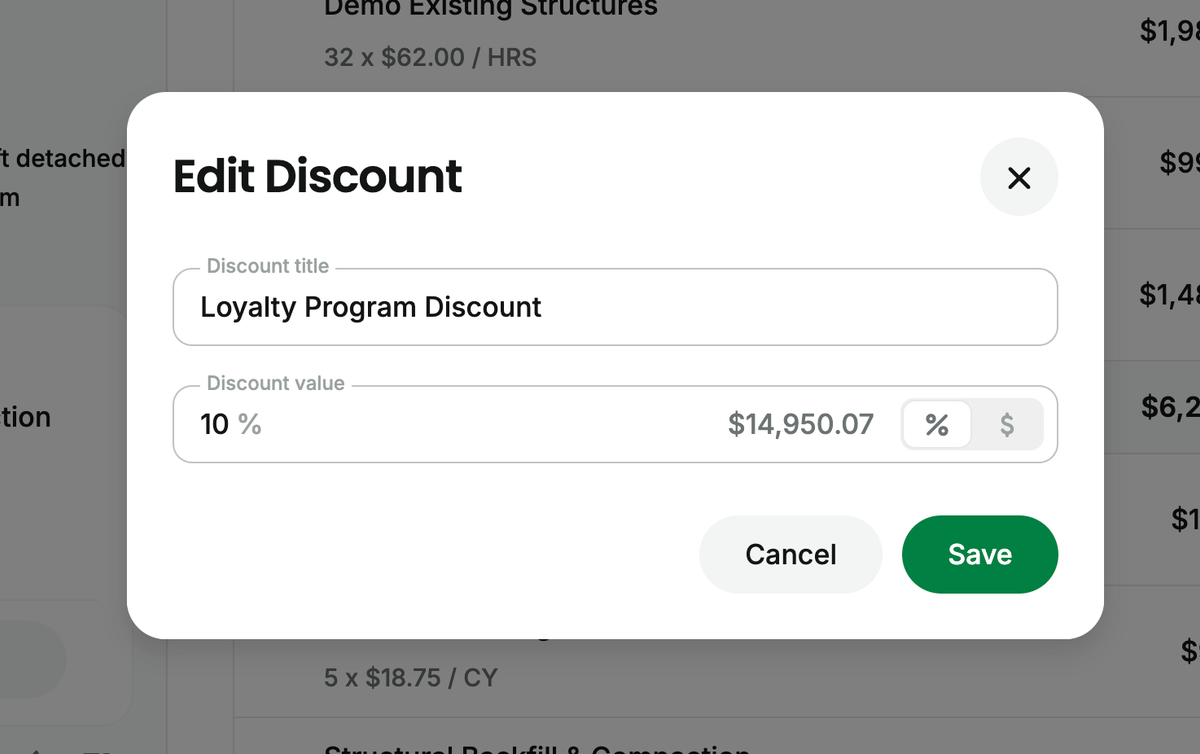 Previously, contractors had to add these discounts as negative values within the estimates. This led to confusion with how it was displayed on the proposal and how markups applied. Now, discounts are their own standalone value, easy to calculate, and easy to present to clients.