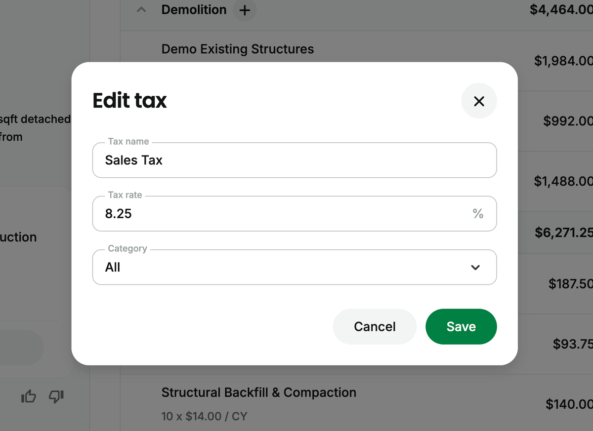 Apply a tax percentage after your subtotal. You can set tax to apply to just materials, just labor, or all items. No need to bury tax in markup percentages or add it as a line item manually. The tax cost automatically recalculates as you update it.