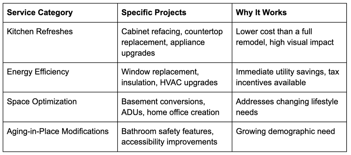 While major renovation projects may experience longer sales cycles during economic uncertainty, smaller improvement projects maintain consistent demand. These "quick win" services serve multiple strategic purposes: they provide immediate cash flow, require lower customer commitment, and often serve as entry points for larger future projects.