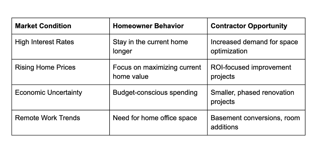 The fundamental principle remains unchanged: when homeowners stop moving, they start improving. By aligning your services with this reality, implementing strategic marketing approaches, and leveraging technology for operational efficiency, you can not only survive market downturns but use them as catalysts for business growth.