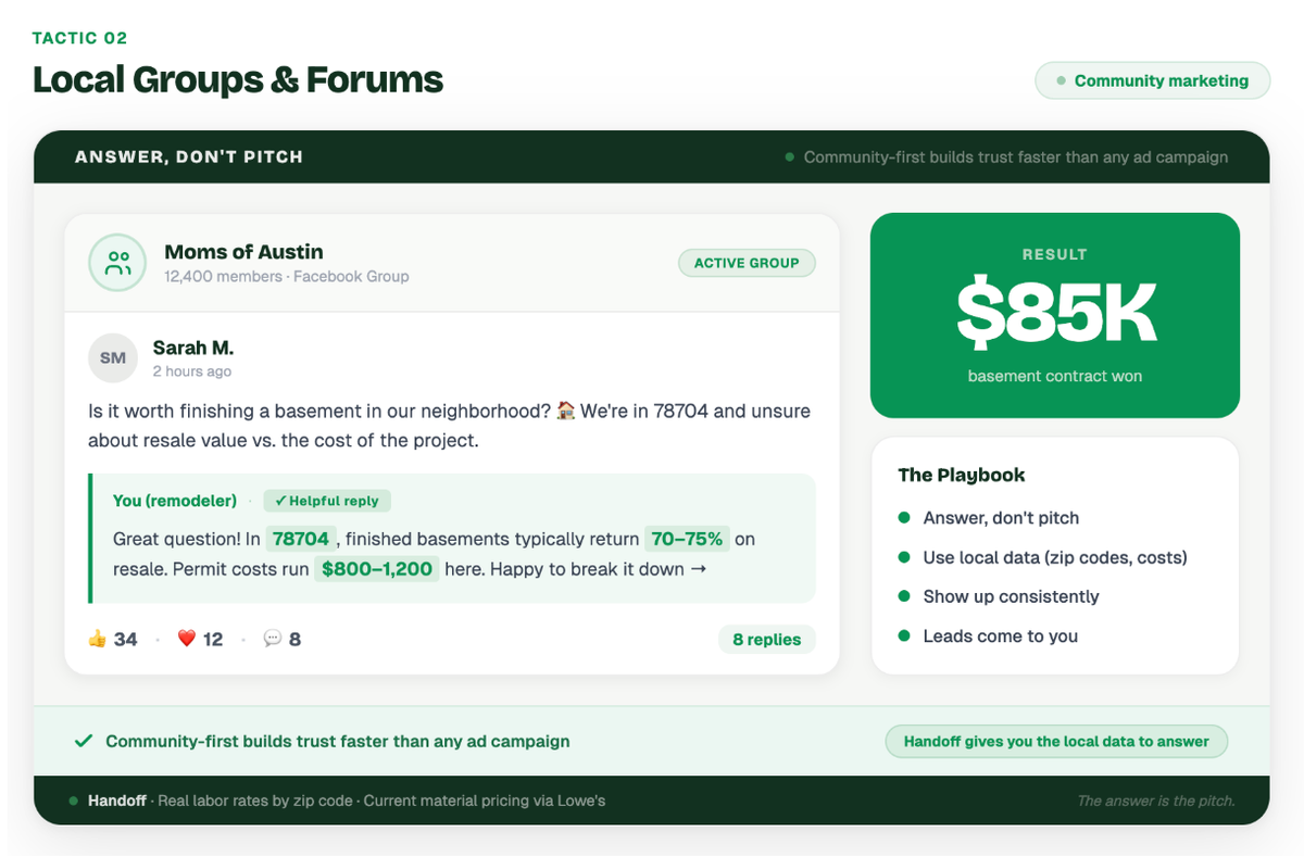 Example: A remodeler joined a local "Moms of Austin" Facebook group. Instead of pitching their services, they simply answered questions when homeowners asked for advice on permitting or material costs. When one member asked, "Is it worth finishing a basement in our neighborhood?", the remodeler provided a detailed breakdown of average ROI for that specific zip code. That helpful response led to a $85,000 basement finishing contract.