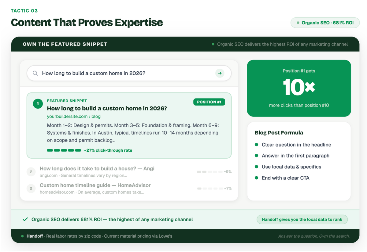 Example: A builder noticed clients constantly asking about the timeline for custom builds. They wrote a comprehensive blog post titled "How Long Does It Take to Build a Custom Home in 2026? A Month-by-Month Timeline." Because it directly answered a common question with clear, structured data, Google featured it as a snippet at the top of the search results, driving a steady stream of organic traffic to their site.