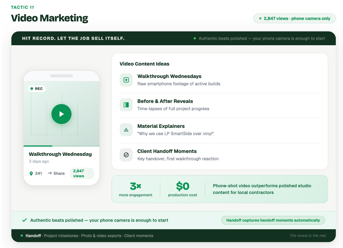 Example: A builder started filming raw, unedited "Walkthrough Wednesdays" on their smartphone. Every Wednesday, the owner walks through an active job site, explaining what the framing crew is doing or why they chose a specific type of insulation. These authentic, educational videos posted to Instagram Reels built massive trust with their audience, showing they have nothing to hide behind the drywall.
