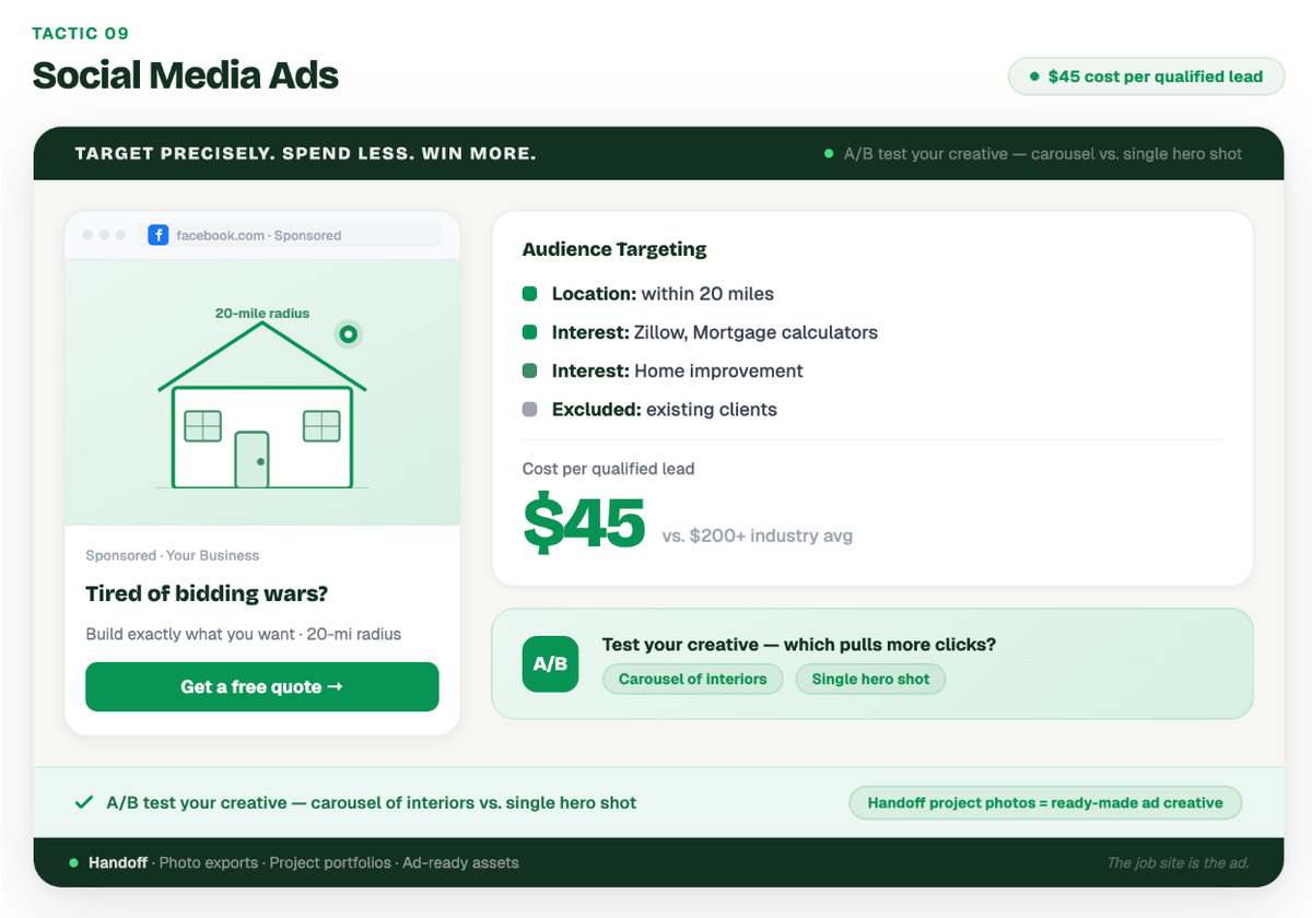Example: A builder running a new subdivision campaign used Facebook Ads to target users within a 20-mile radius who had recently shown interest in "Zillow," "Mortgage Calculators," or "Home Improvement." The ad featured a carousel of their model home interiors with the headline, "Tired of bidding wars? Build exactly what you want." The campaign generated leads at a cost of just $45 per qualified inquiry.