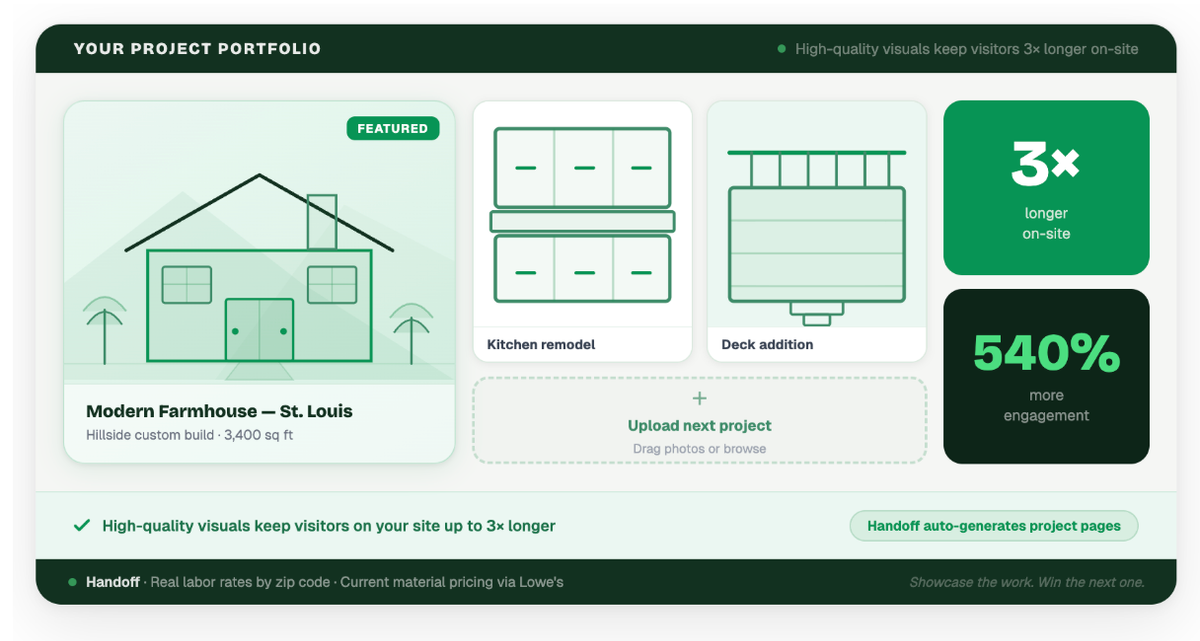 - Visual proof converts: High-quality project portfolios and before-and-after galleries keep visitors on your site up to 3x longer.