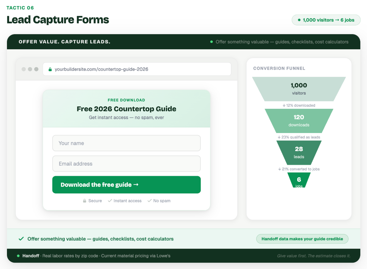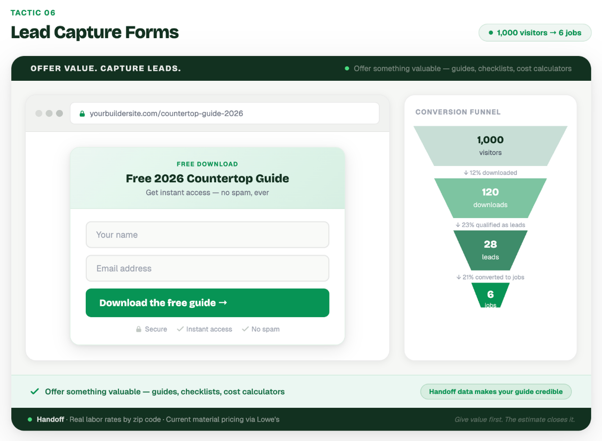 Example: A luxury custom homebuilder added a pop-up form to their website offering a free, downloadable PDF titled "The 2026 Guide to Selecting Premium Countertops." To download it, visitors had to enter their name and email address. This strategy captured the contact information of homeowners who were clearly in the early research phase of a remodel, allowing the builder to nurture them via email over the next six months.