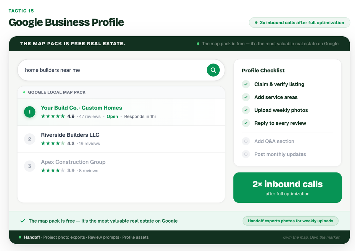 Example: A contractor noticed they weren't showing up when people searched "home builders near me." They fully optimized their Google Business Profile by adding their exact service areas, updating their business hours, and uploading weekly photos of their job sites directly to the profile. Within a month, they moved into the top three results in the Google Maps section, doubling their inbound phone calls.