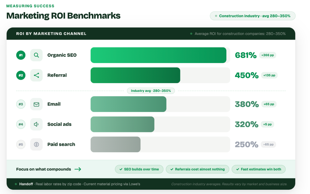 - ROI is measurable: The average marketing ROI for construction companies ranges between 280% and 350%, with organic SEO driving the highest long-term returns at 681%.