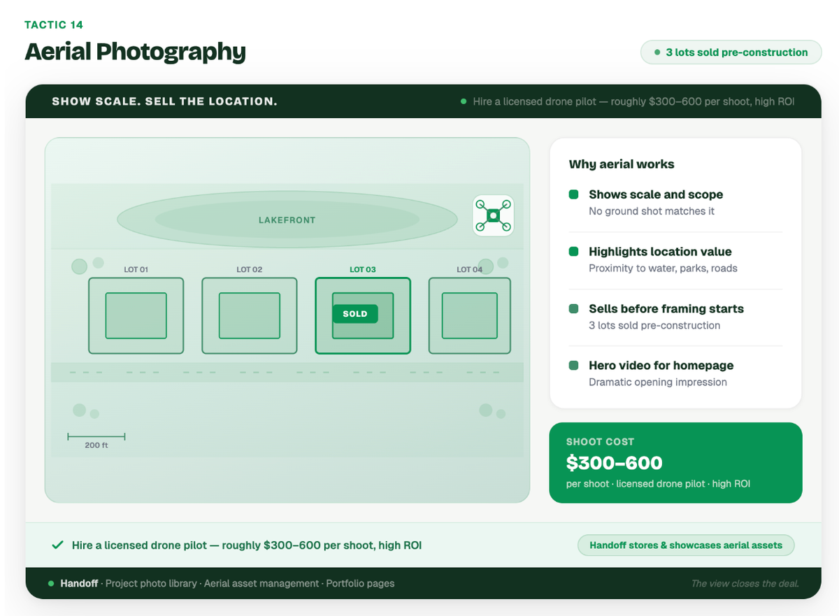 Example: A builder developing a new community on a scenic lakefront hired a drone pilot to capture sweeping video of the lots, showing their proximity to the water and the surrounding tree line. They used this footage as the hero video on their website's homepage. The dramatic aerial perspective sold three lots before the model home was even framed.