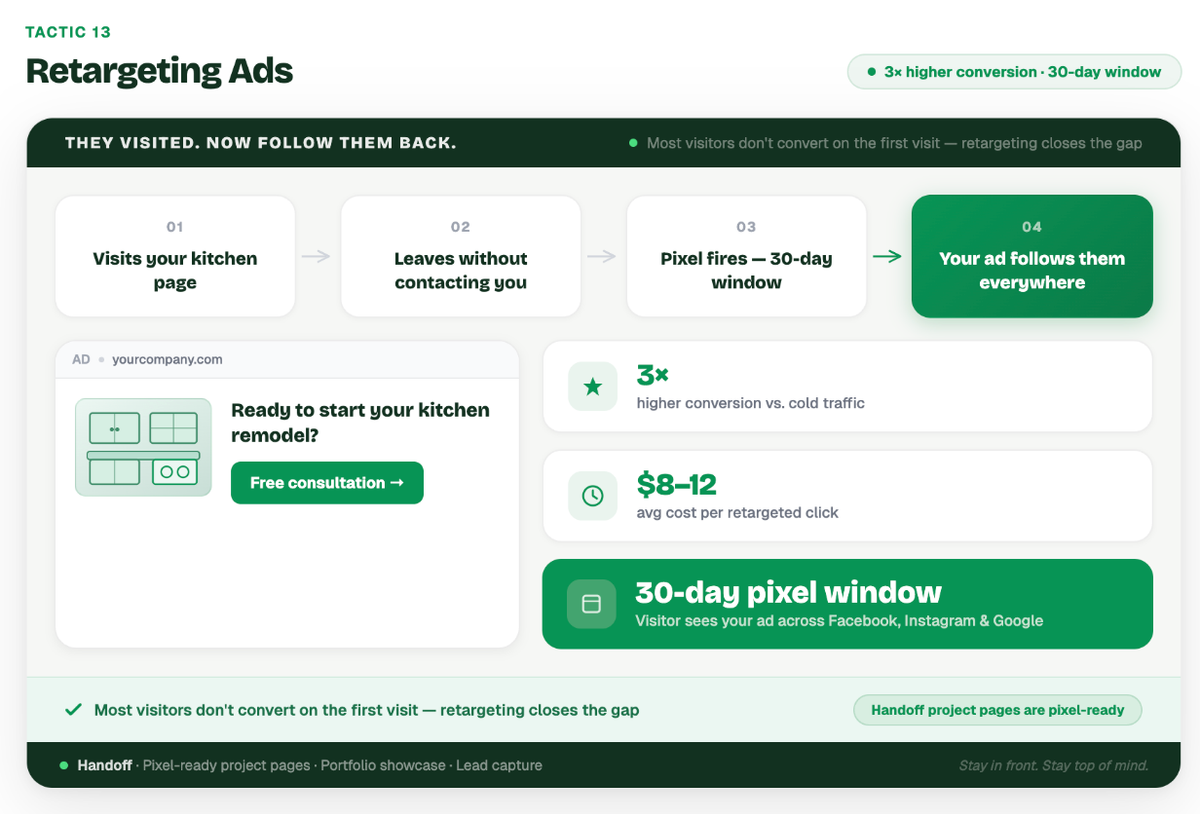 Example: A homeowner visits a builder's "Custom Kitchens" page but leaves without filling out a contact form. The builder uses Google Ads retargeting so that for the next 30 days, while that homeowner browses other websites or reads the news online, they see banner ads featuring the builder's best kitchen projects with the text, "Ready to start your kitchen remodel? Get a free consultation."
