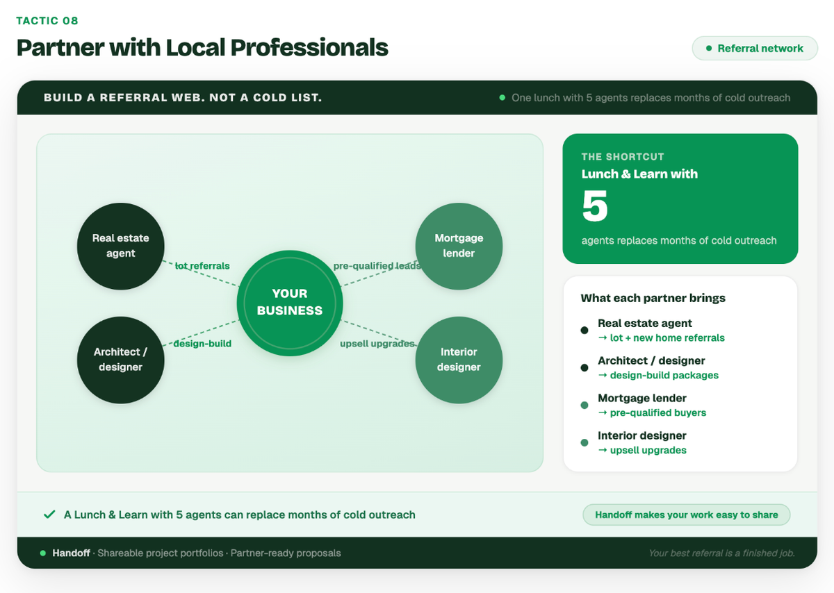 Example: A homebuilder hosted a "Lunch and Learn" event at their office, inviting five top-producing local real estate agents. The builder educated the agents on current construction costs per square foot and how to identify lots suitable for custom builds. In return for this valuable education, the agents began exclusively referring their clients who couldn't find existing inventory to this specific builder.